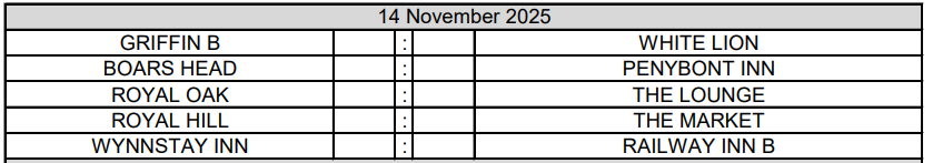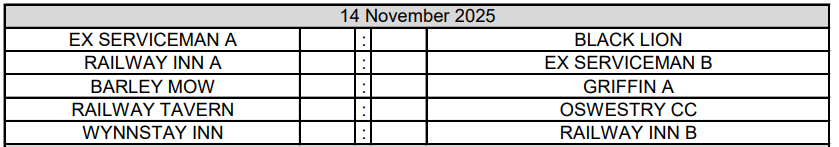 FIXTURES FOR FRIDAY 14 NOVEMBER 2025