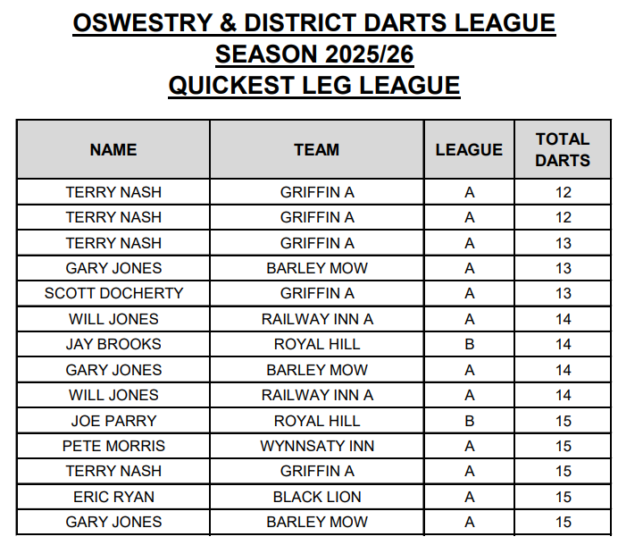 FEWEST DARTS LEAGUE All finishes with 15 darts or less will appear here as and when the results come in to the League Secretary, any discrepancies then please contact the League secretary soonest. Last updated 21 MARCH 2026