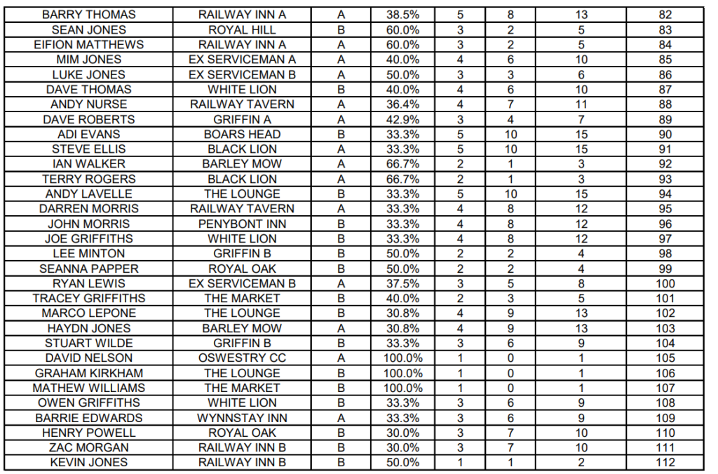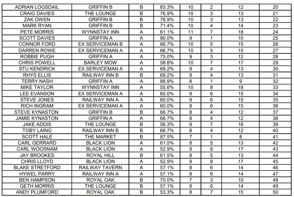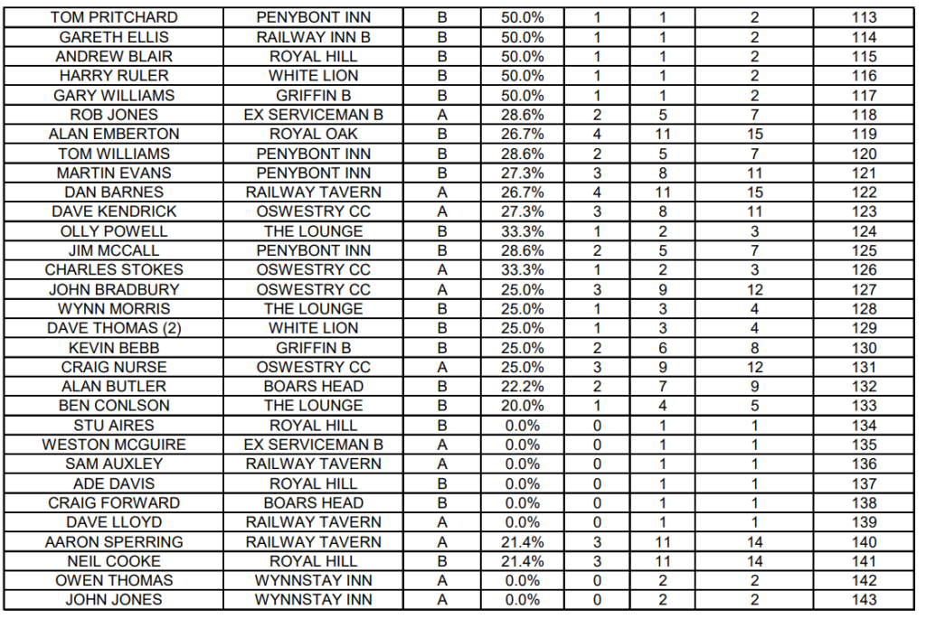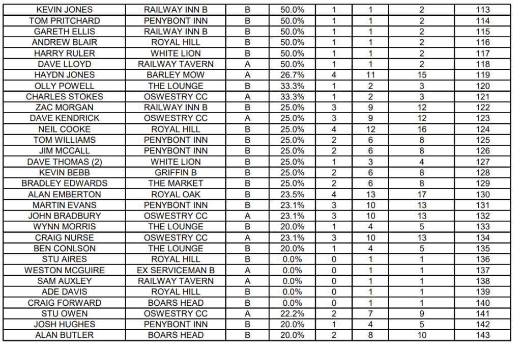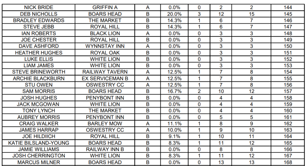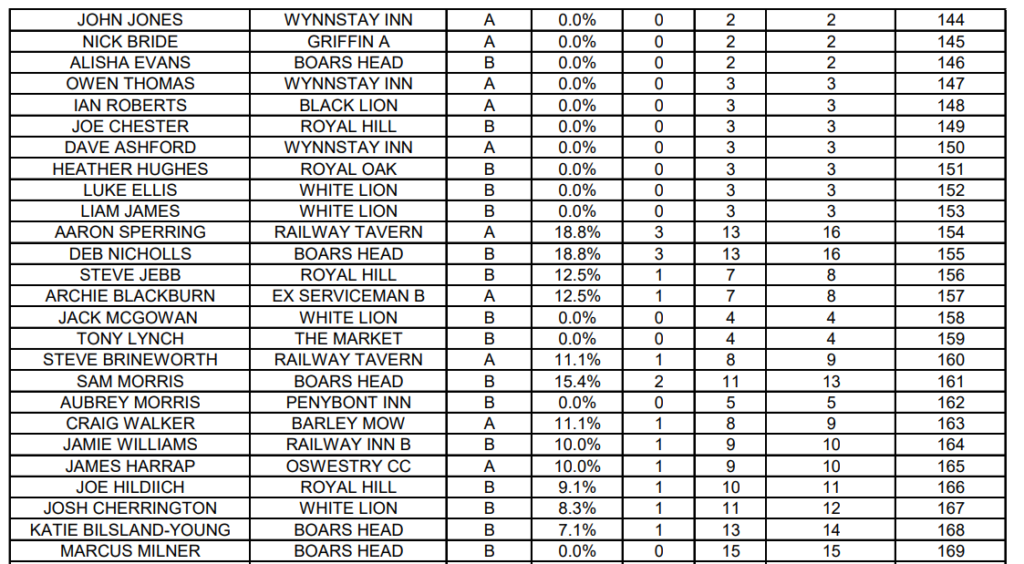 - Players that are registered with the league but have played no games will not be shown in the table.