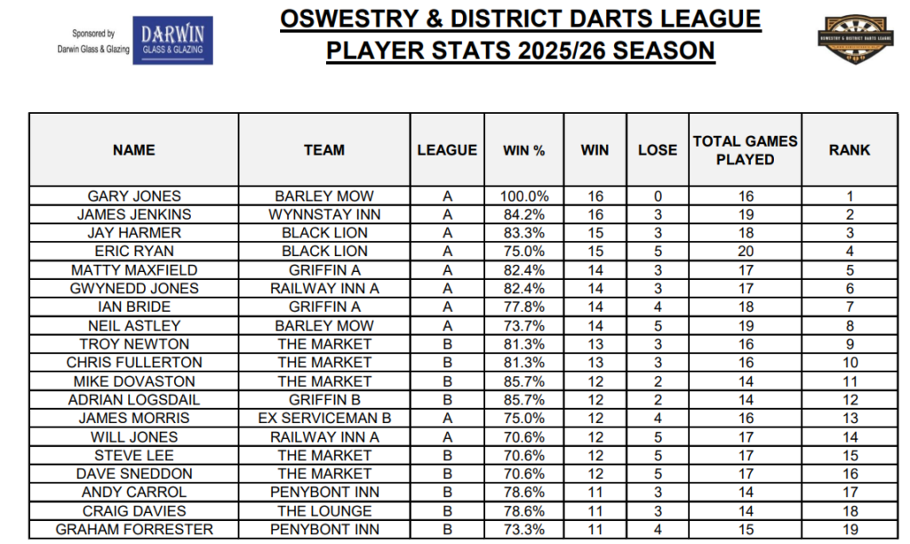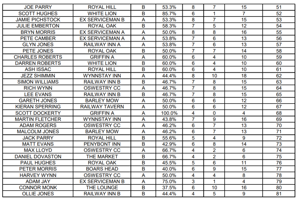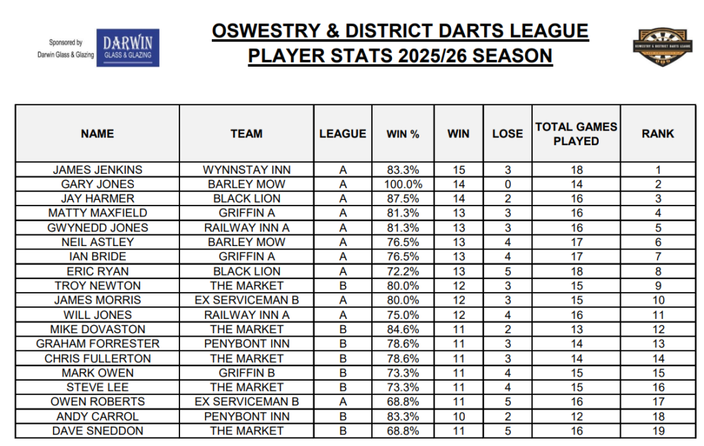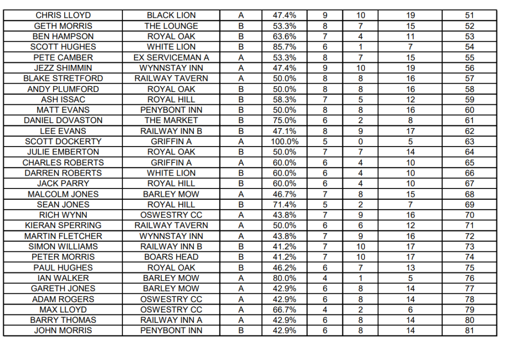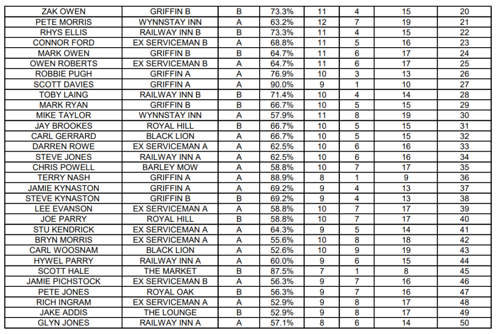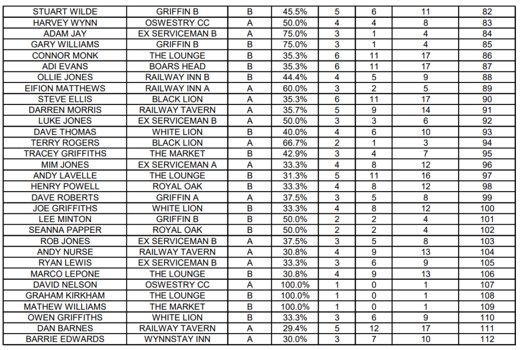 - Players that are registered with the league but have played no games will not be shown in the table.