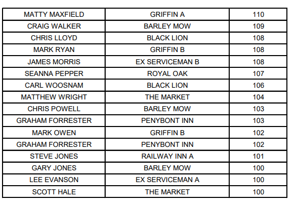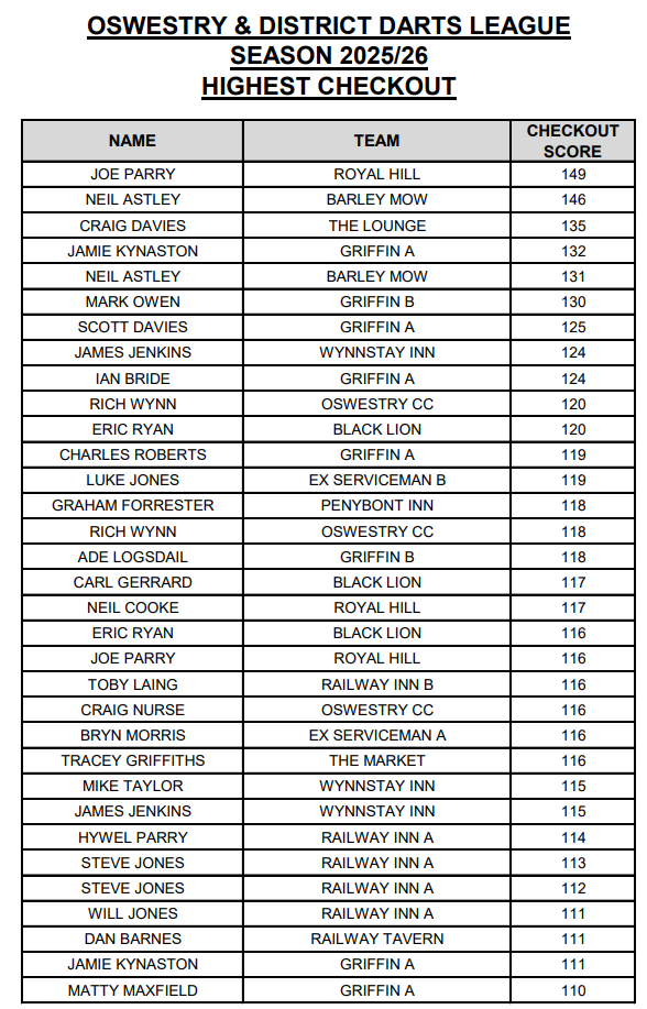 HIGHEST FINISH LEAGUE All ton + finishes will be published here as and when the results come in to the League Secretary, any discrepancies then please contact the League secretary soonest. Last updated 14 FEBRUARY 2026